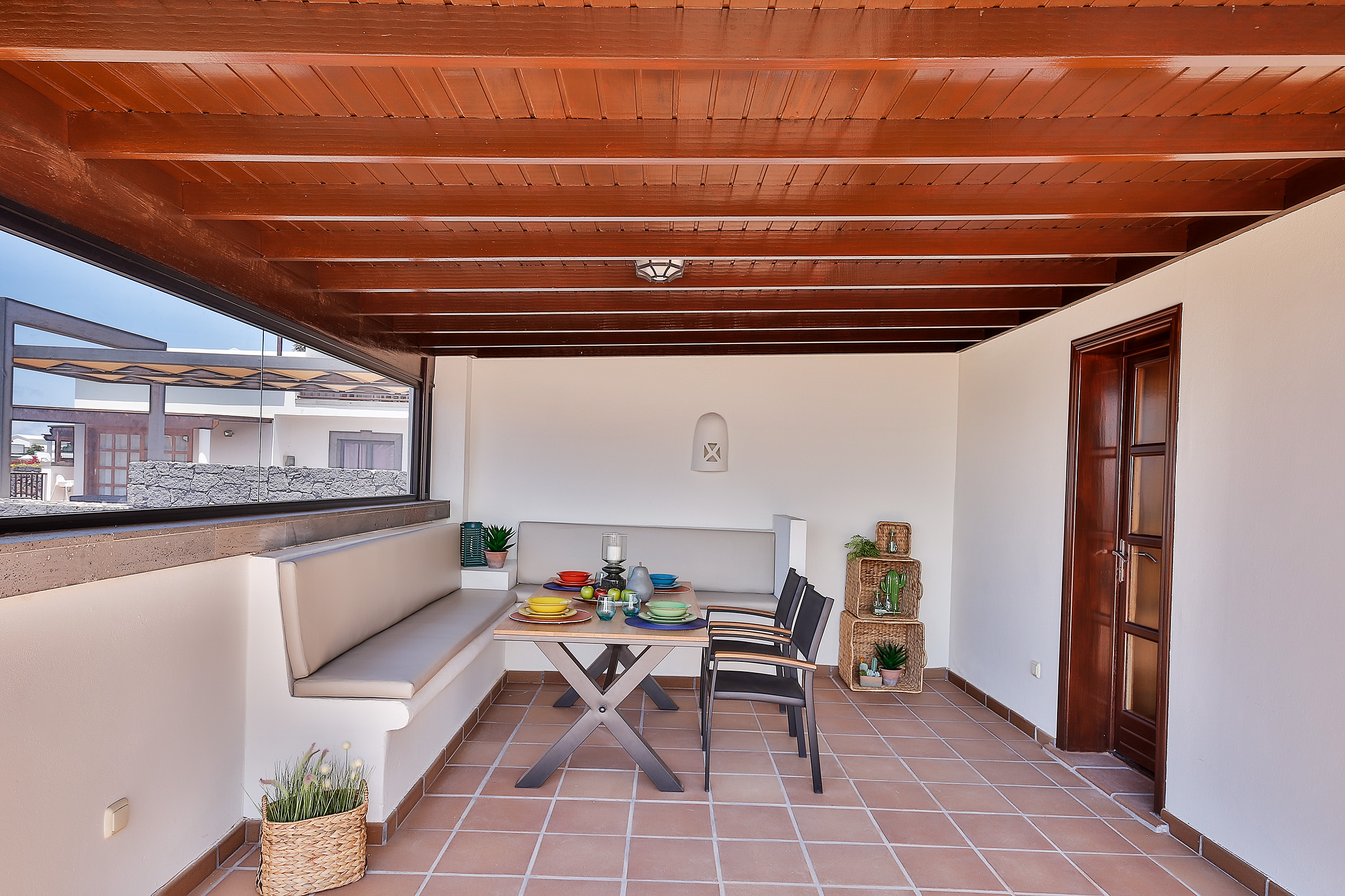 Terraza comedor al aire libre, protegida del viento.